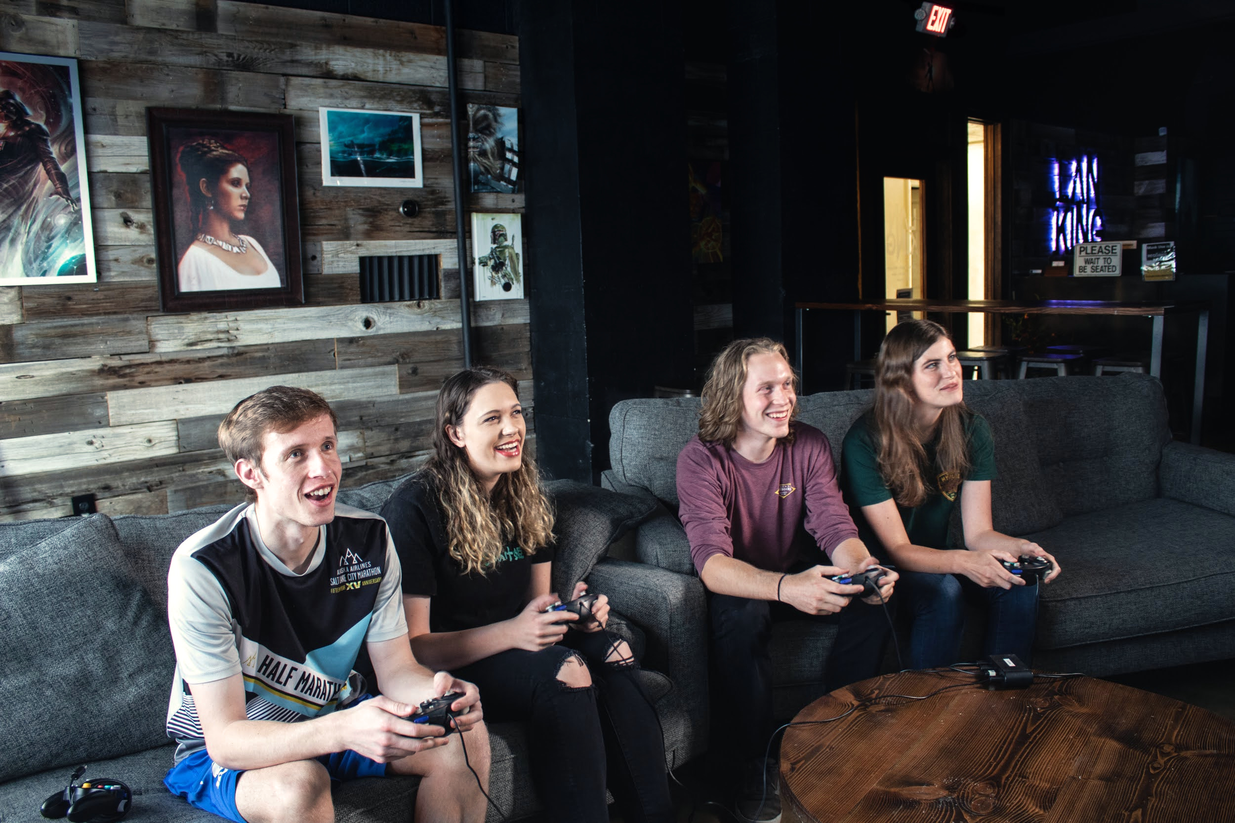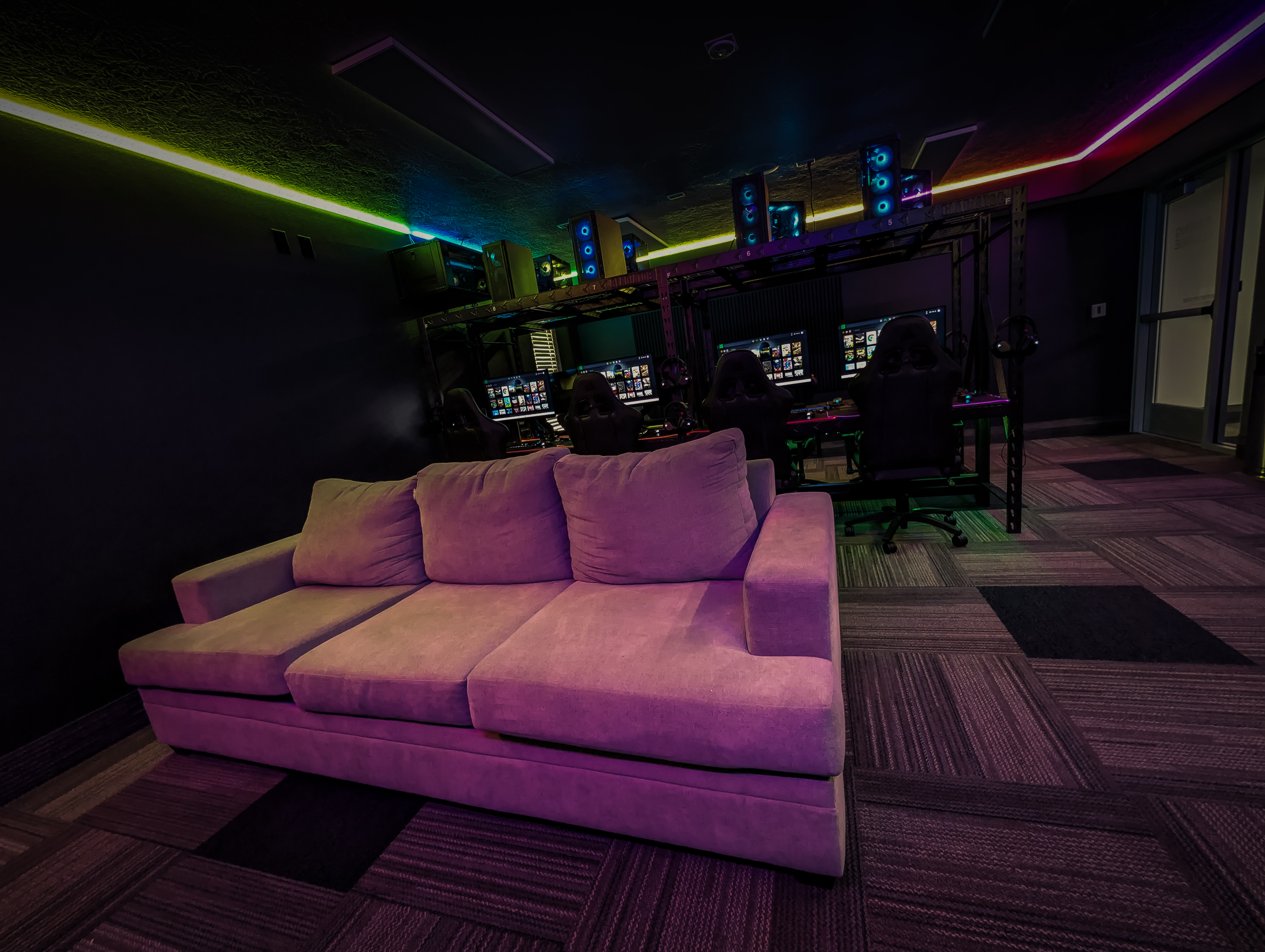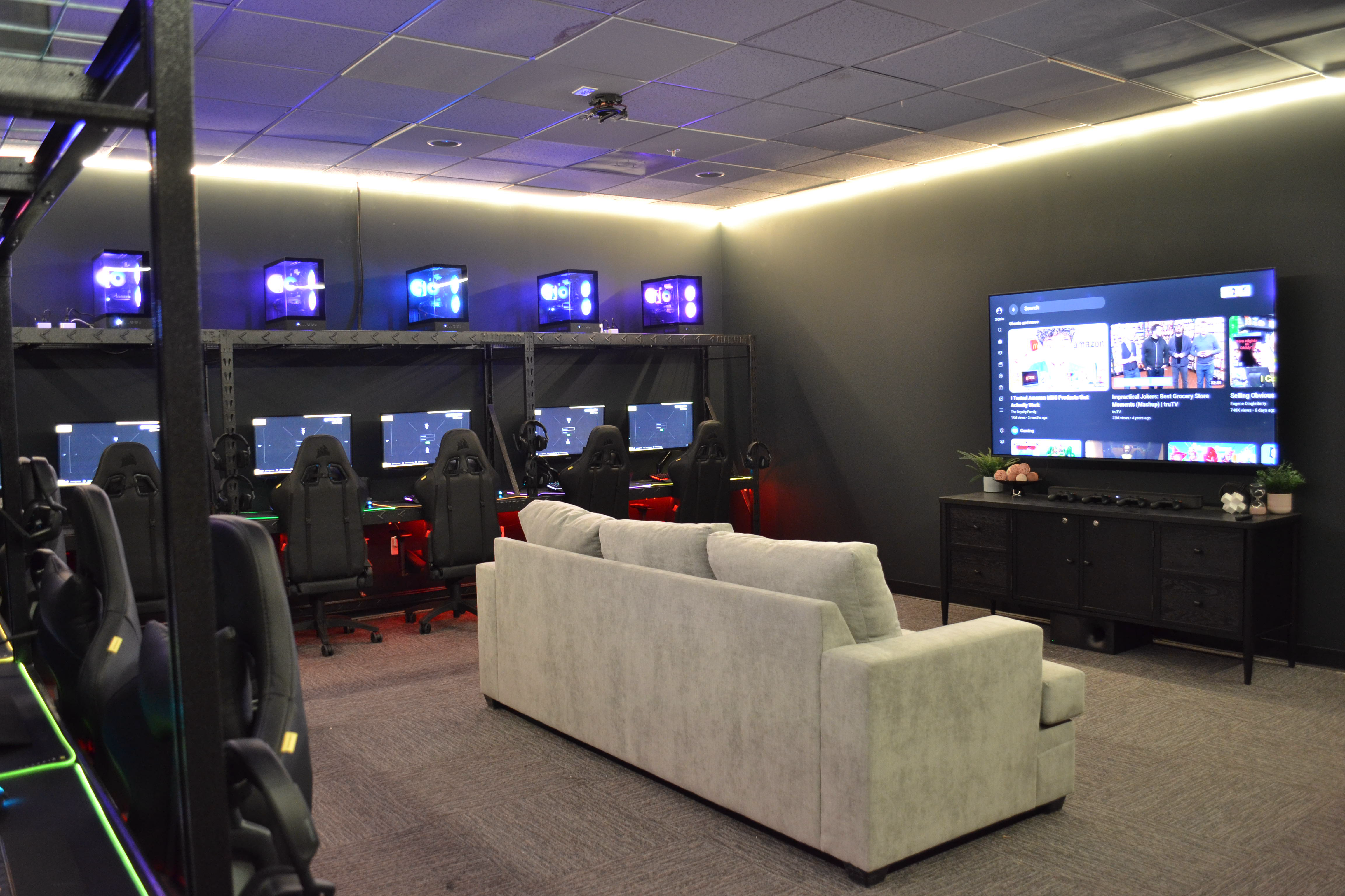 Comfortable couches and chairs designed for group play and spectating
